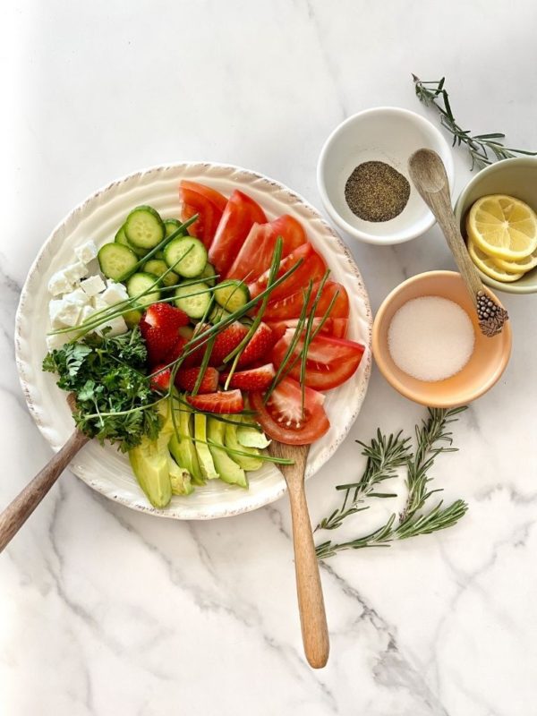 1. Arrange cucumber, avocado, tomato, strawberry slices and feta cheese on a serving plate.