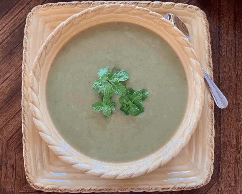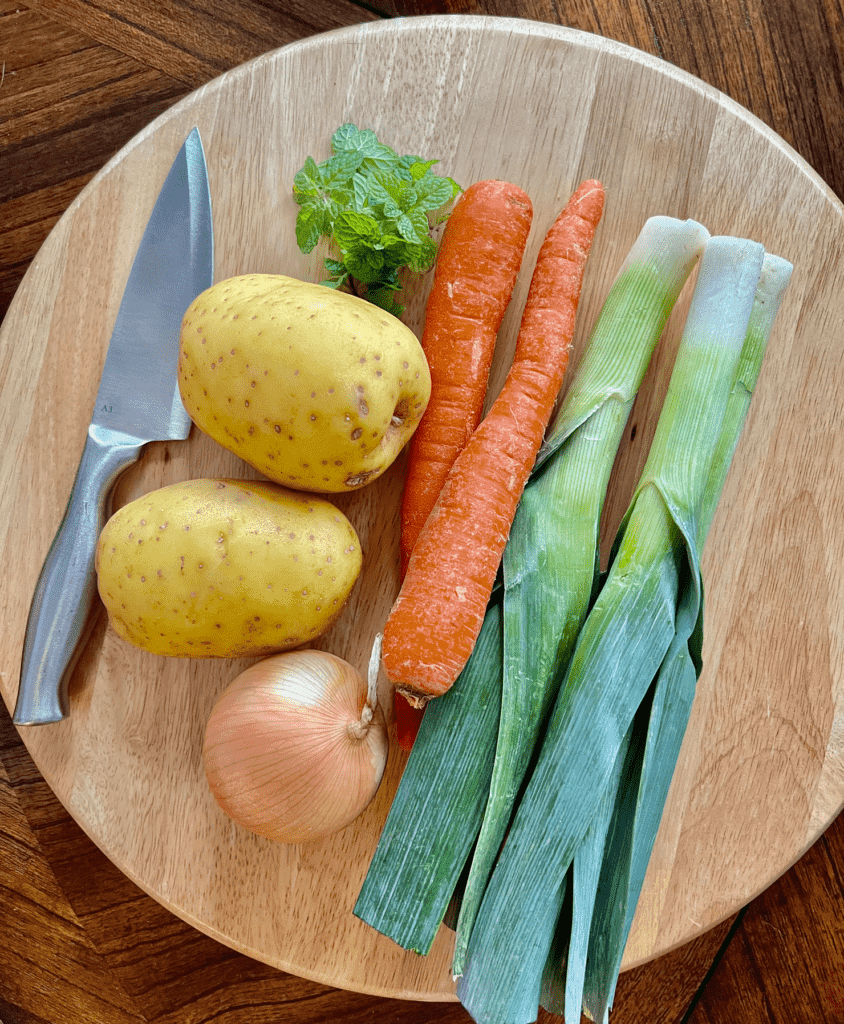 Put olive oil in a large pan and saute with onions until they turn pink. Add flour stirring frequently. Add potatoes, carrots, leeks, salt, and hot water. Half cover and cook for about 20-25 minutes over low heat. Add milk stirring continuously until the soup is slightly thickened and removed from the heat. Puree the soup with a hand blender. Garnish with fresh mint leaves and serve immediately.