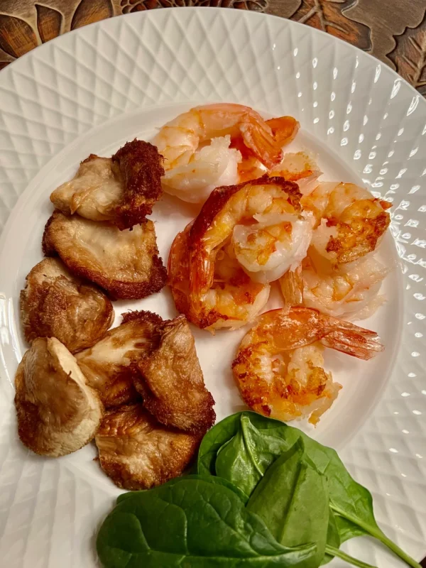 Wash the mushrooms and slice them. Dry with a paper towel. Heat olive oil and butter in a medium skillet. Add the mushrooms and cook over medium heat for 2 minutes. Flip and cook for another 2 minutes until both sides are browned. Serve immediately with your favorite main dish like fried shrimps in my case.