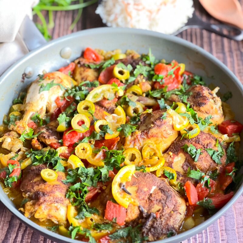 This is a traditional Moroccan dish of chicken pieces fried lightly and then stewed slowly with aromatic spices, garlic, onion, olives and lemons.