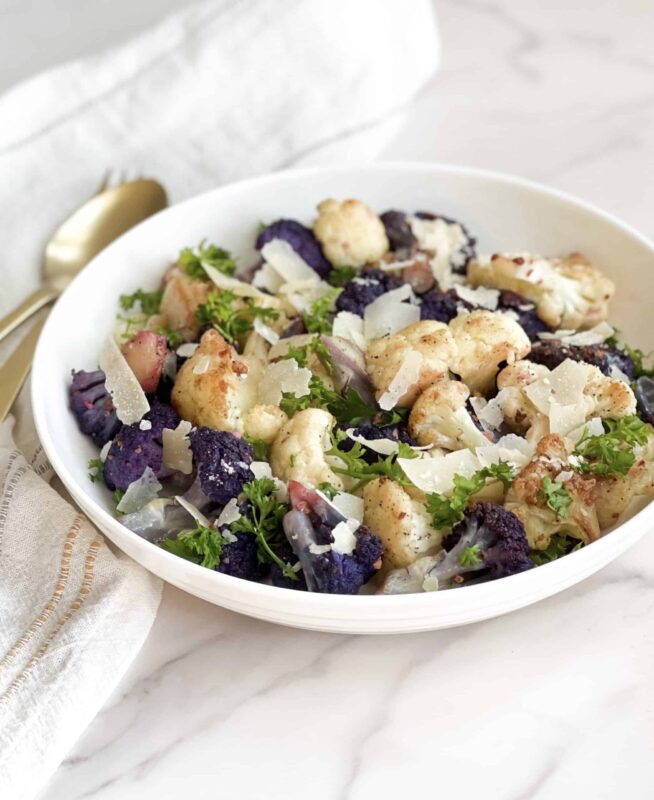 Cauliflowers happened to come in all different colors- white,purple and yellow. But if you can’t find the colored variations,this recipe also works great with regular white cauliflower.